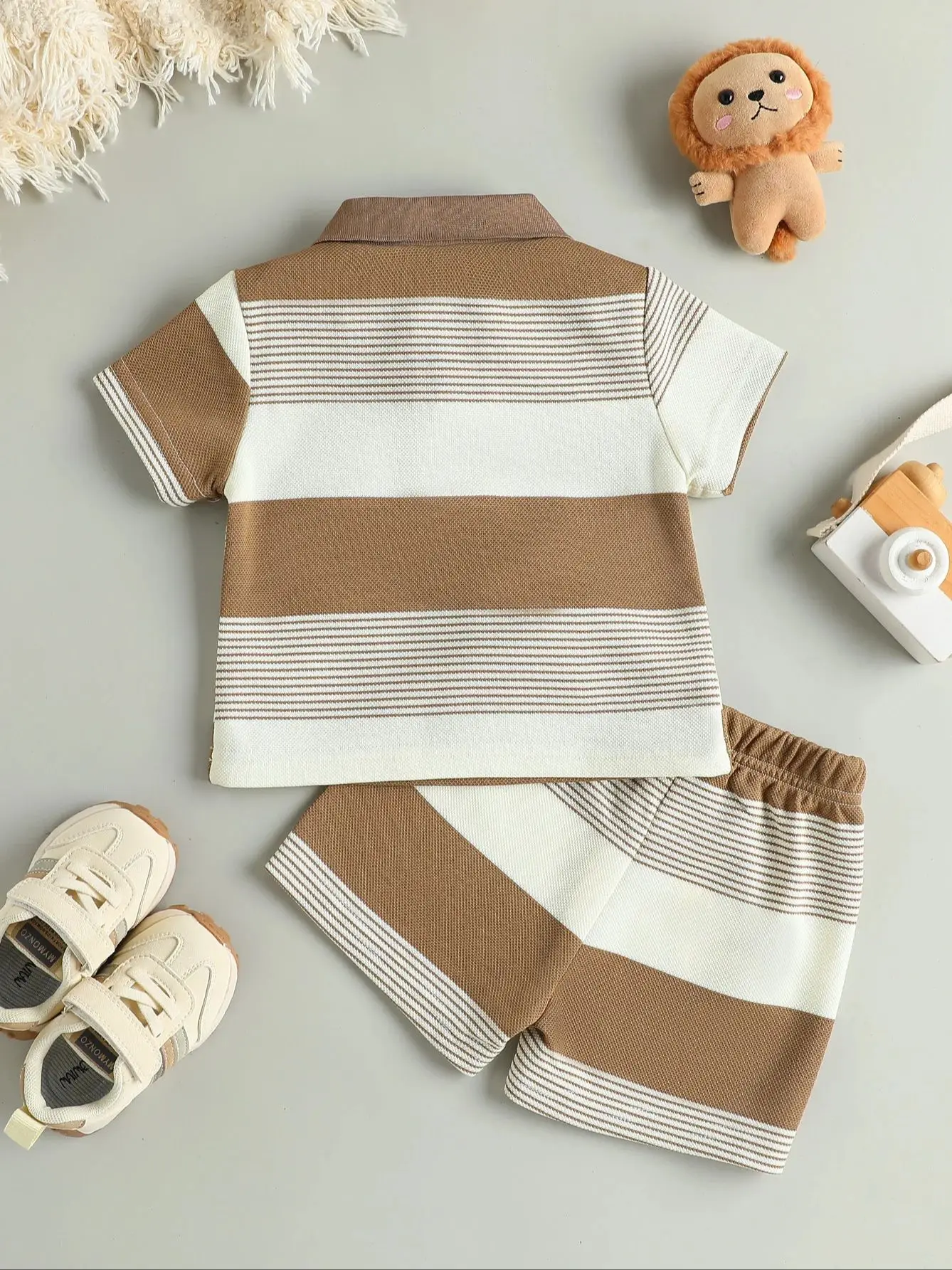 Composto por uma camiseta de gola polo listrada em tons marrons e nudes com um charmoso ursinho bordado na frente, acompanhada de uma bermudinha super confortável.